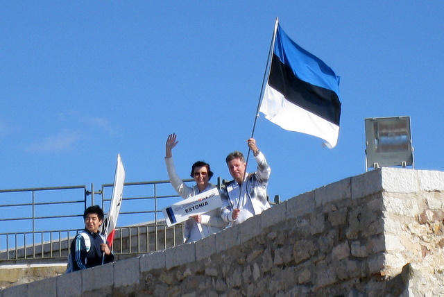 Avamisüritus toimus kaunis mereäärses mereväe kaitseehitises, mille nimeks oli Tour Royale. Tegemist oli merekindlusega, millel olid kõrged müürid ja tornid ja suur siseõu. Õues toimuski pidulik avamine, linnapea, korraldajate ja televisiooni osavõtul. Kõik oleks muidu tore ja nauditav olnud, kui ilm poleks täna eriliselt külm olnud. Päikese käes ja tuulevarjus oli meeldivalt soe aga merelt puhus meeletult kõva ja külm tuul. Võistlejad pidid koos oma riigi lippude ja plakatitega ronima kõrgele üles avatorni, kus koguneti rivvi, et siis mereväe orkestri saatel trepist alla laskuda. Selleks , et kõik oma koha üles leiaks kulus oma pool tundi ja seda kõrgel jäise tuule käes. Mõned targemad eirasid korraldajate ettekirjutisi vormi osas ja olid jopedes aga suurem jagu võistlejaid oli ainult võistlussärgis. Pikapeale omandasid paljude näod vaatamata päikesele sinaka varjundi… All kindlusehoovil olid siis pealtvaatajad ootamas paraadi. Tuul oli kohati nii tugev, et püüdis lippe käest rebida. Õnnelikult said siiski kõik tähtsad oma kõned peetud ja tõlk tõlgitud. Kõigele vaatamata oli üritus ülev ja eriti jäi meelde vaade päikeselisele avamerele. Maismaa poole vaadates kõrgusid linna taustal kõrged ja kaljused mäed. Tõesti imeline loodus. Bussid tõid kõik ilusti koduklubisse, kus jätkus rahvatantsijate eestvedamisel tants ja trall. Ülle ja Riina vihtusid mingi kohaliku polkarütmis vahvat ringtantsu, meie Aarega jälgisime seda veini saatel eemalt. Eks see eesti mees on ju TANTSULÕVI….muidugi kui enne peo lõppu käima saab…